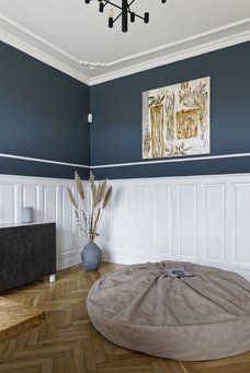 Caroline Bircow har været flittig med malerrulle og -pensel og malet samtlige rum i den gamle villa i Helsingør. I spisestuen er der høje, hvidmalede paneler, stuk og sildebensparket i eg. Den petroleumsblå vægfarve er Dyrup Underground Lake (PPG 1035-6). Bordet på sort jernstel af brugte skibsplanker er designet af Kasper Boye fra One Funky Furniture og lavet på mål. Stolene er fra Ilva.