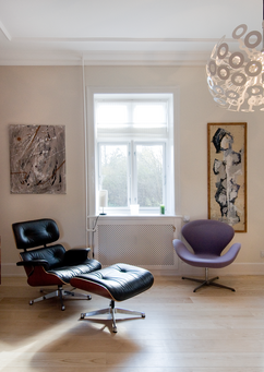 - Et lille plus, når man indretter sig med mange designmøbler, er, at der så fremkommer en renhed, som giver ro i sindet og for øjet. Her er jo så til gengæld ingen nips eller gamle potteplanter, som giver dårlig samvittighed, hvis de ikke vandes, nusses eller støves af, siger Rebecca.