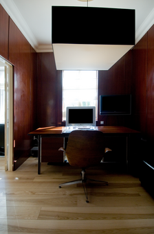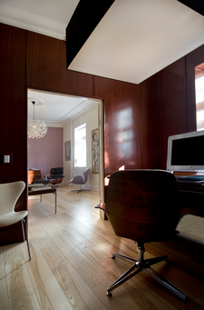 Hvert rum har sit helt eget look, når det kommer til tapet, vægfarve og materiale. Det ses særligt i kontoret, hvor den mørke, polerede mahogni hensætter beskueren til en nærmest filmisk stemning lidt a la New York i 1950’erne. Og det er i denne stemning, Ben arbejder med sine egne filmproduktioner.