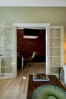 Hvert rum har sit helt eget look, når det kommer til tapet, vægfarve og materiale. Det ses særligt i kontoret, hvor den mørke, polerede mahogni hensætter beskueren til en nærmest filmisk stemning lidt a la New York i 1950’erne. FOTO: Jesper Ray