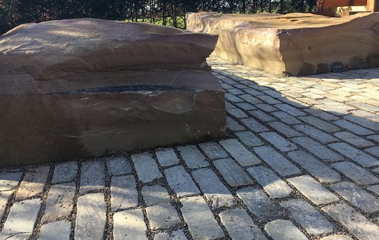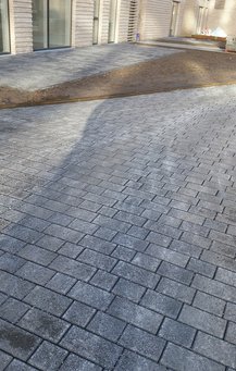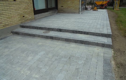 - Fyld grus eller små skærver mellem stenene og komprimér med tromle eller vibrator. Vælg kornstørrelse over 2mm.