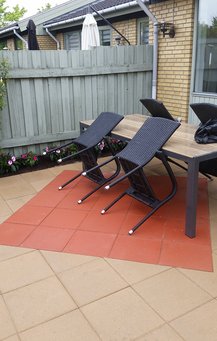 Når du anlægger en terrasse, er det også ofte muligt at lægge belægningen, så regnvandet ender i græsplænen eller i et bed, uden at det giver risiko for vandskade på huset.