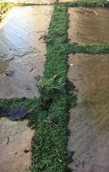 Jorden i hulrummene skal ikke gå helt op til overkanten af stenene. På den måde vokser græsset beskyttet lidt nede, så det ikke slides af trafikken på fliserne.