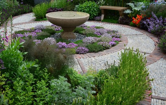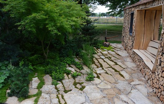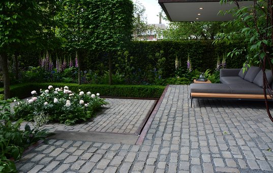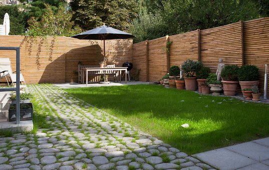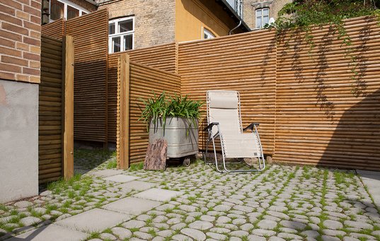 Du kan fx nøjes med en enkelt eller et par terrasser i nærheden af huset eller i et solrigt hjørne i stedet for at lave én stor terrasse rundt om huset. Hvis en stor del af haven er udlagt med græsplæne og bede, kan regnvandet frit sive ned igennem jorden.