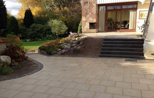 Til terrassen og indkørslen kan du også vælge en belægning af grus, perlegrus, granitskærver, stenmel el.lign. Disse belægninger er jævne og stabile, så du kan have dine havemøbler stående eller parkere din bil på dem uden problemer. Og så har de den fordel, at de lader regnvandet sive igennem og ned i jorden.