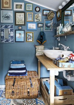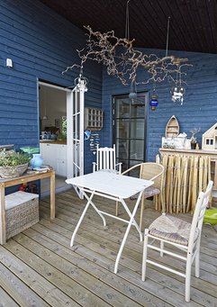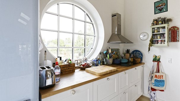 – Jeg havde ønsket mig et stort rundt vindue. Det fik jeg i køkkenet ud mod vejen, og det er i høj grad med til at definere huset. Det samme gør de mange nuancer af blå, som går igen i alt, hvad jeg ejer også på tøjet! Blå passer til et træhus med sommerhusstemning, synes jeg. Et pudset murstenshus i blåt ville derimod være lidt aparte.