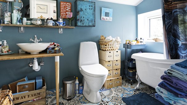 – Jeg har længe drømt om at få et Smeg køleskab, og det fandt jeg endda i lyseblåt. De marokkanske fliser på badeværelsesgulvet er også et længe næret ønske at kunne kigge på hver dag. Det fik jeg opfyldt sammen med den specialbyggede reol.