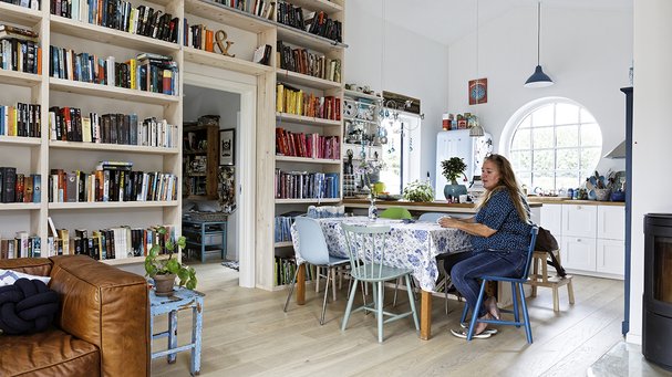 På gulv-til-loft-reolen af kraftigt spærtræ i den højloftede stue med åbent til kip har Lone Theils fået plads til sine 1.500 bøger. De er både på dansk og engelsk og er samlet gennem tiden, selvom hun har prøvet at reducere antallet i forbindelse med flytningen. Hun læser meget, og bøger har altid været en stor del af hendes liv. Hun kan godt gå forbi en skobutik, men aldrig en boghandel uden at kigge ind og købe. Og så ejer hun 350 kogebøger, da madlavning er en anden passion.