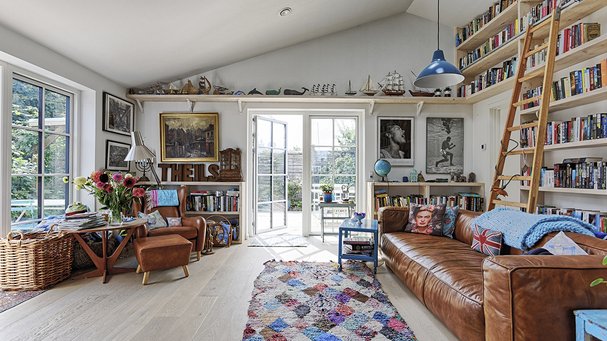 Lænestol og fodskammel er købt i England, hvor Lone Theils boede i 16 år. Pladsen i højden udnyttes med en lang hylde til blandt andet modelskibe.