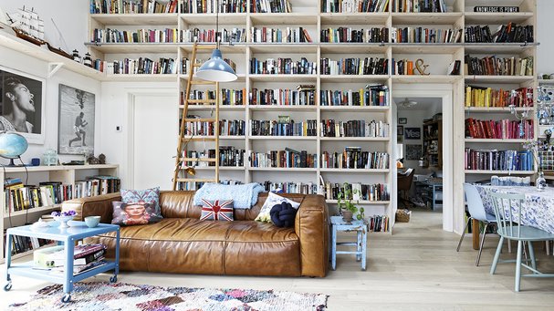 Den store, centrale stue er åben til kip med en solid reol af spærtræ på hele den ene langside. Her og på andre reoler er plads til Lone Theils over 1500 bøger, heraf 350 kogebøger. Sofaen er fundet i en møbelforretning i Bruxelles.