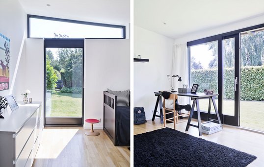 Tilbygningen indeholder 2 teenageværelser og et multirum med garderobe og hjemmearbejdsplads. Køkkenet er åbnet op mod stuerne og har fået nye elementer og et skjult emfang i loftet. Alle soveværelser har fået store glasskydedøre til haven, og der blev plads til et ekstra badeværelse. Belysningsplan med bl.a. 45 loftspots hjælper med at definere og lyse rummene yderligere op.