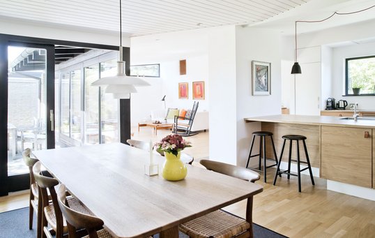 Trods husets mange kvaliteter trængte det dog til en opdatering. Det gamle køkken var et lille, indeklemt rum, men blev åbnet op mod stue og spisestue, og det nye køkken i egetræ passer fint til familiens store samling af møbelklassikere.