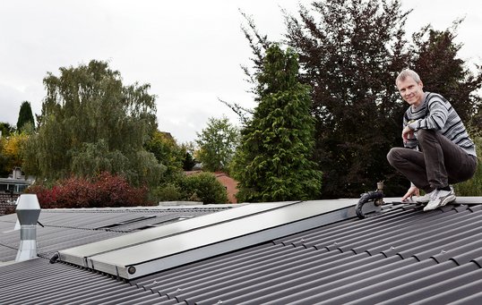 Husets solfangere varmer familiens brugsvand op og arbejder desuden sammen med jordvarmeanlægget i et helt nyt system. Når solvarmeanlægget har opvarmet vandet til den maksimale temperatur, bliver overskydende varme sendt ned i jorden, hvor det kan gavne jordvarmeanlæggets varmeproduktion.
