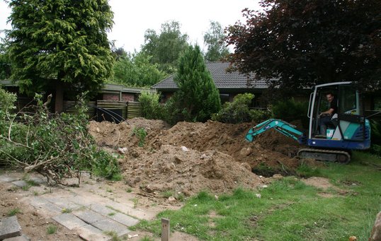 For at installere jordvarmeslangerne i jorden måtte håndværkerne grave 1,2 m dybe og 1 m brede rande, så der lå kæmpe bunker af opgravet jord. Da jordvarmeanlægget var installeret og hullerne dækket til igen, var al jord, grus og muld i haven blandet sammen til lerjord, der ikke kunne opsuge regnvand. Først et halvt år efter kunne en gartner anlægge haven på ny.