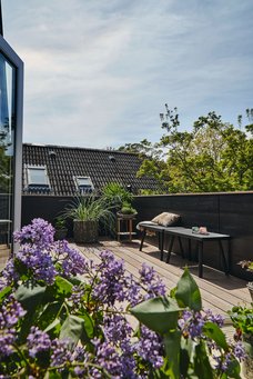 - Materialer udvendigt: Træhus med sort tegltag og terrasser med cumaru-terrassebrædder, som passer godt ind med skoven i baghaven.