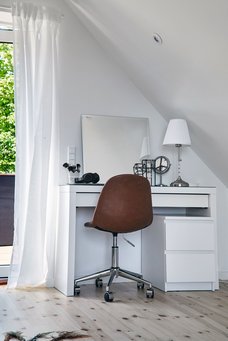 – Det har været praktisk for os som børnefamilie, at jeg har arbejdet hjemmefra. Jeg indrettede mig med et lille kontor i førstesalens karnap og brugte ellers min bærbare som mobilt 'kontor'. Men især nu, hvor jeg skriver krimier sammen med Line Holm, drømmer jeg om at få mere plads med et stort skrivebord og udsigt over vandet. Et slags refugium med ro til at skrive, som jeg også oplever, når jeg tager væk på skriveophold. Det ville også være en fordel at kunne få ro til at lave podcast i et minihus, som stadig er tæt på familien, siger hun.