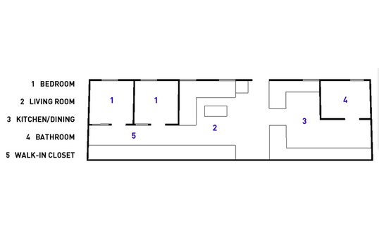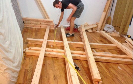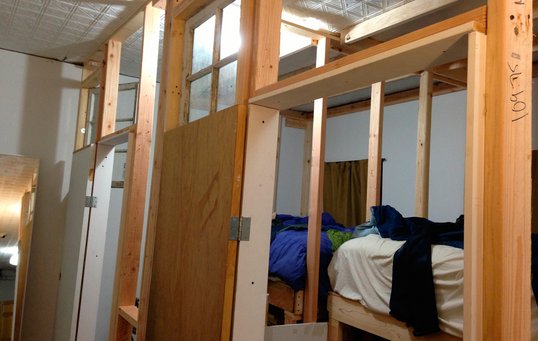 De 2 kammerater startede med at opsætte 2 hemse, der kun lige var store nok til at kunne rumme deres senge, side om side i den ene ende af lejlighedens rum. Derefter byggede de vægge omkring og mellem hemsene.