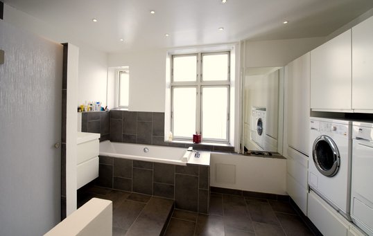 Familien manglede i dén grad et vaske- og opbevaringsrum. Ved at slå væggen ned mellem badeværelset og et depotrum, blev der plads til både badeværelse og vaskerum i ét åbent rum.