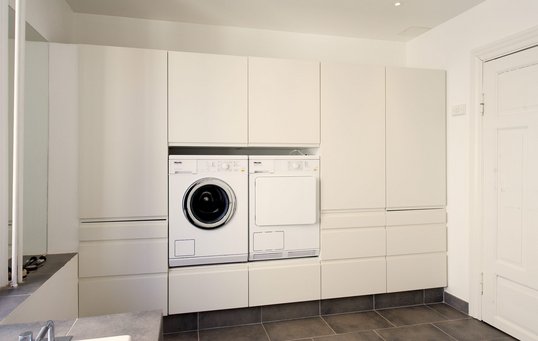I vaskeafdelingen har familien en tørretumbler, vaskemaskine, tøj og håndklæder placeret i en samlet skabsvæg.