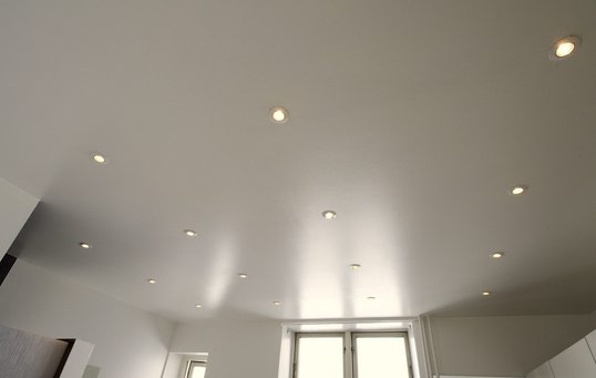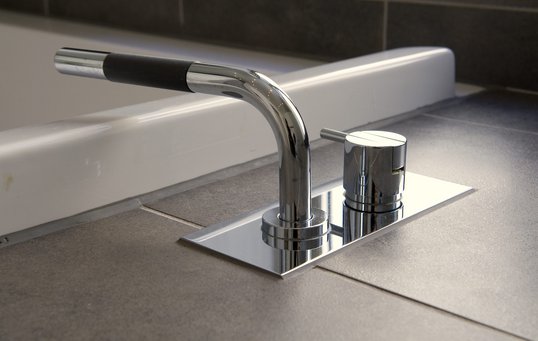 Indretningen er i en kantet, high-tech stil med rene liner og designer sanitet fra bl.a. designerne Arne Jacobsen og Philippe Starck.