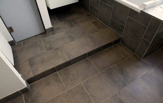 Et niveauspring i flisebelægningen optager højdeforskellen mellem de gamle rum og adskiller badeværelsesafdelingen fra den tørre vaskeafdeling.