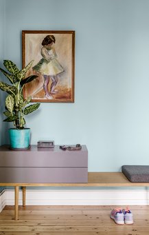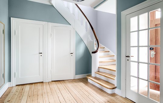 Lys, blå farve i entréen og gæstetoilet: G47 Hosta fra Dyrup