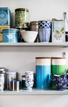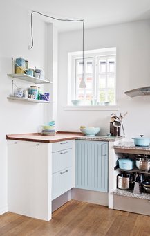 Og sådan fortsætter det huset igennem. Entréen er malet i en lys, blå nuance, soveværelset er en rolig base i en muldvarpe-grå nuance, og husets eneste hvide rum er køkkenet. Her får et par blå køkkenlåger, farverige opbevaringskrukker, krydderier og tedåser i stedet lov til at give kulør, mens Rikkes arbejdsrum i kælderen er en farvelade af garn og strikdesign.