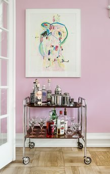 – Jeg elsker de originale rammer, som er enormt charmerende, men jeg har også brug for at sætte mit eget præg på omgivelserne. Ved at lege med farverne har vi fundet andre og flere kvaliteter frem i huset. Med farverne understreger vi, at rummene kan forskellige ting – fx er tv-stuen mørkere, fordi det er et rum, man trækker sig tilbage til, en hyggelig hule. Den lyserøde stue er et kreativt og lyst rum til både arbejde og samtale, mens den grønne spisestue er vores grønne link til haven, forklarer Rikke.