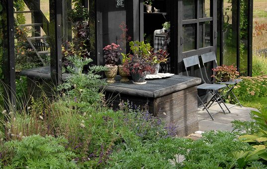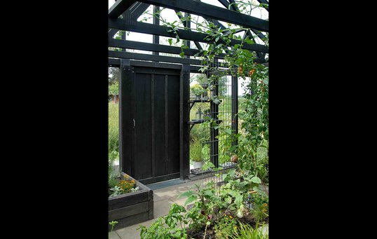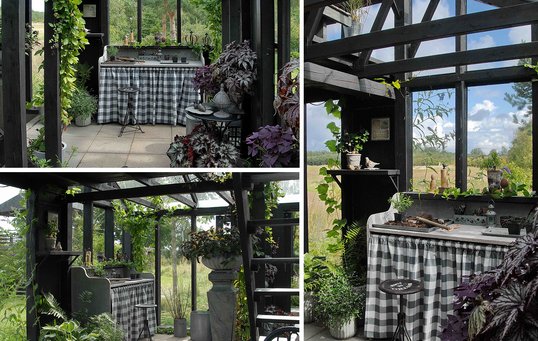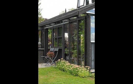 Heldigvis rakte tålmodigheden, og resultatet er blevet et flot drivhus i to etager med rum til flere formål. Alt træværk er malet sort, hvilket giver en smuk indramning og understreger det grønne rum. Samtidig er den sorte farve med til at få byggeriets mange forskellige slags genbrugstræ til at se ens ud.