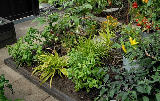 Der er skydedøre ud til det fri i to af siderne, hvilket også betyder, at parret kan skabe gennemtræk på varme dage. I den nordvestlige ende er der anlagt bede til at dyrke en masse forskellige grøntsager og blomster – ikke mindst krydderurter, tomater og chili.