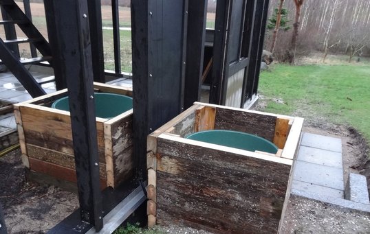 Meget af vandet kommer fra en opsamling af regnvand, som opbevares i to store tønder. I den modsatte ende af drivhuset er der en arbejdsafdeling med pottebord og opbevaring, og blot et trin ned herfra er der en kombineret spise- og opholdsafdeling med brændeovn.