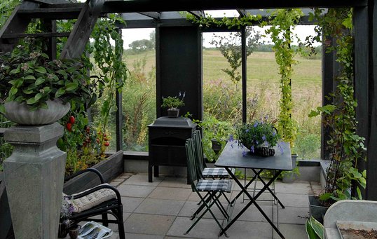 Den gode plads gjorde det også muligt at placere drivhuset efter ønske – og derfor er det placeret med længdeaksen i retningen Nordvest/Sydøst og på den nordlige del af grunden med udsigt ud over de bølgende marker, som støder op hertil.