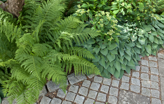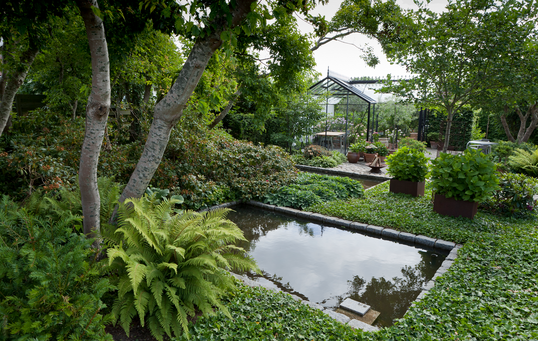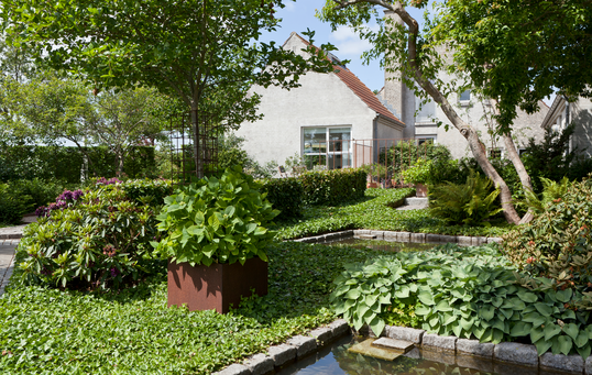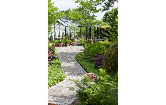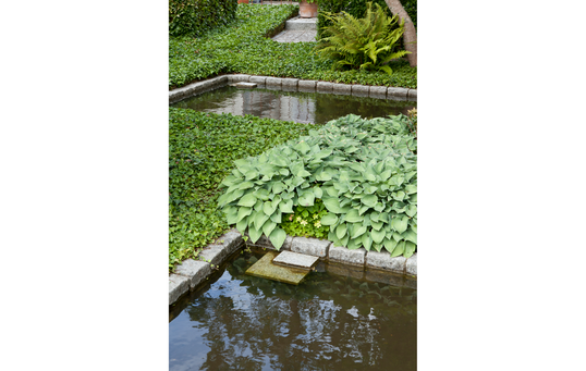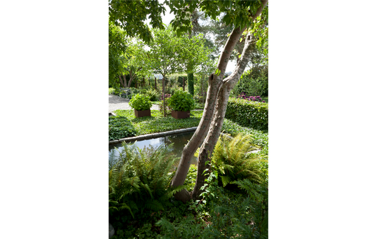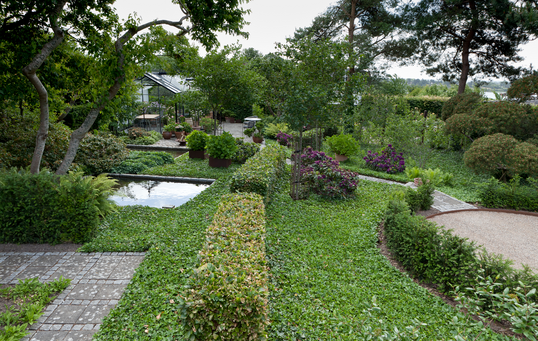 Derfor er store dele af haven i dag dækket med efeu. Grågrønne hosta giver sammen med bregner variation over det vandrette tæppe, og formklippede grønne skulpturer står rundtomkring i haven. Her er hortensia og rododendron, hække og robuste stammer. Og selvom farven overvejende er grøn, er der mange forskellige strukturer, linjer og forløb.