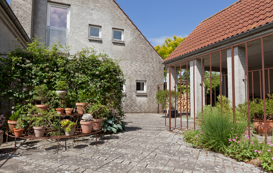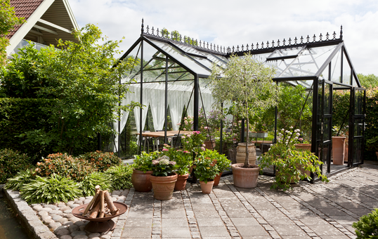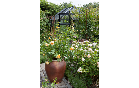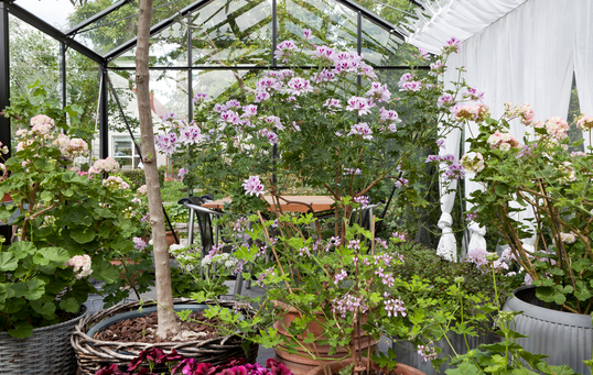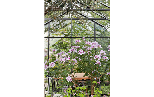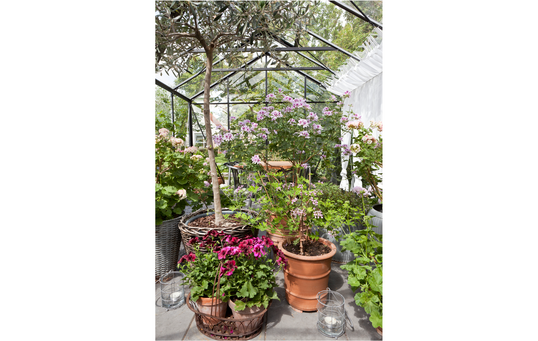 I bunden af haven ligger et stort orangeri, hvor parret både spiser og slapper af. Vin, oliven og mange duftpelargonier giver liv, og et par appelsintræer fra Florida gør duften eksotisk og skøn.