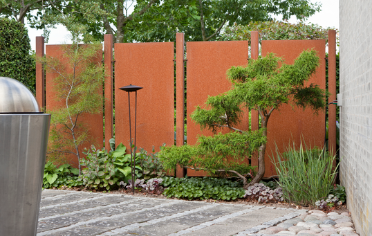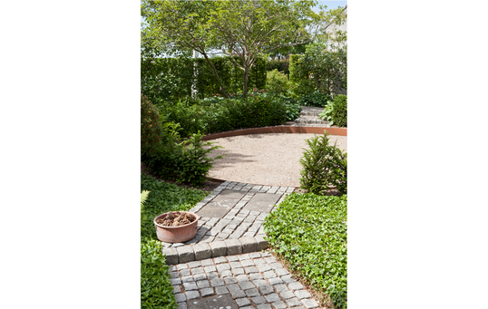 Seneste tiltag er en cirkelrund plads med slotsgrus, som ligger, hvor græsplænen tidligere var. Et bredt, rustent jernbånd holder gruset på plads, og efeutæppet er udvidet, så det omslutter den runde plads, for de har erkendt, at efeu er langt det letteste at passe.