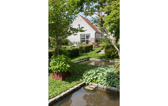 Nede i haven ligger to flotte spejlbassiner lidt forskudt og på hvert sit niveau. Haven er fyldt med skrå linjer, og der er en højdeforskel på over en meter mellem den høje og den lave have. De skrå linjer skyldes grunden, som er bredere i bunden af haven, og det er fremhævet på smukkeste vis.