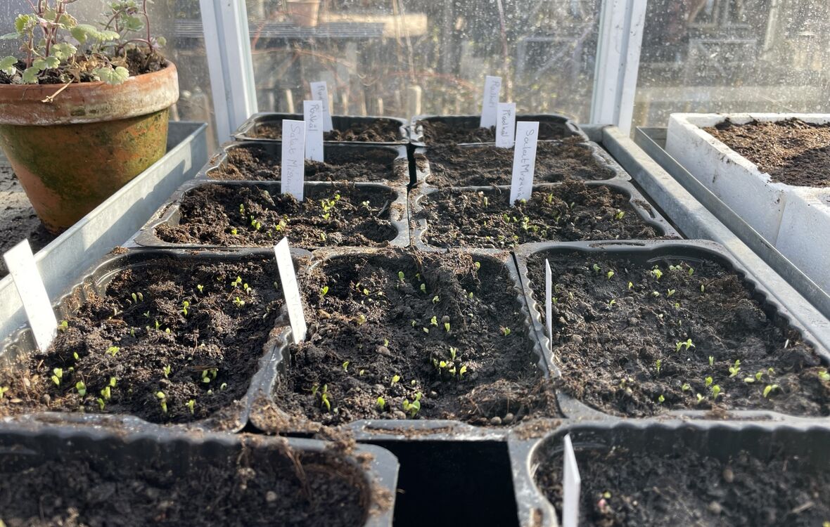 Du kan også bruge andet til at dække planterne til, fx et glaslåg eller klart plast. Der skal bare være plads til, at planterne kan gro uden at ramme låget, og du skal nemt kunne løfte låget, så du kan 'lufte ud' dagligt. Regn med, at planterne bliver 5-10 cm høje, inden de skal pottes om eller plantes ud.
