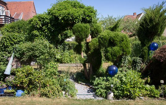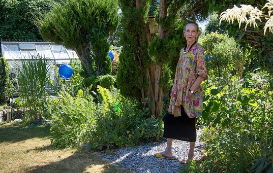 – Jeg er et blåt menneske, siger hun og ler. Hun peger på de blå kupler, hun har hængt op som dekoration fra flere af træerne i haven. Dem fandt hun engang i Magasins container, hvor de var kasseret som dekorationsaffald.