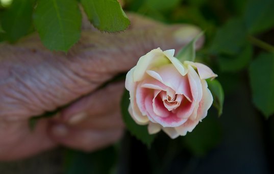 Asta Jahn peger på et lysegrønt blad med lyserød spids. Hun lægger nakken lidt på skrå og ser på det med kærlig mine.