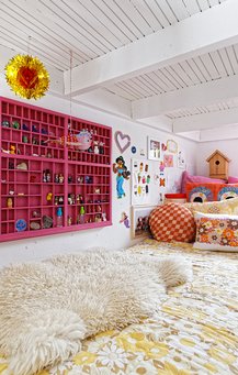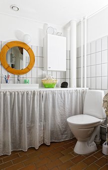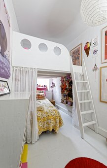 Hemsen i datterens lille værelse var allerede bygget til den tidligere ejers barn, da Pia Olsen overtog lejligheden. Hun har dog fået bygget en ”facade” på, så datteren og hendes kammerater ikke falder ud, men kan kigge ud gennem store glughuller alligevel. Bortset fra selve forankringen af hemsen, er de øvrige materialer MDF, som er malet hvid.