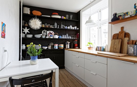 Lejligheden bærer præg af kreative og pladsbesparende løsninger, hvor opmagasinering er både dekorativt og praktisk.