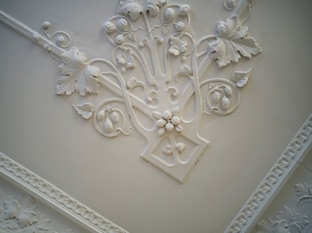Efter længere tids søgning på Instagram fandt hun frem til en stukkatør, der var med på at bevare den originale stuk og rense den med tapetklister og film, som efterfølgende blev fjernet med vand og en kompressor.