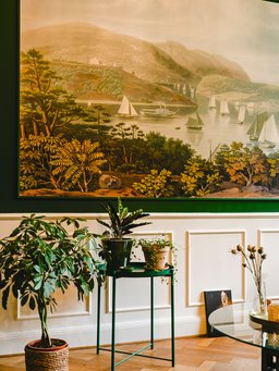 De grønne vægge er inspireret af fortidens farveskala. Da parret fjernede de gamle tapeter, kunne de se de oprindelige farver.
