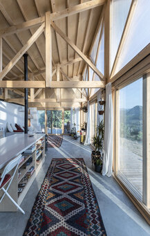 – Huset ligger på en bakket, stejl grund, som gør det vanskeligt at komme til i bil. Derfor byggede vi huset i moduler på en fabrik og samlede så modulerne på grunden, forklarer arkitekt Oral Göktaş og tilføjer, at de mange tanker om at omfavne områdets klimamæssige påvirkning og føre dem ned på tegnebrættet for så at blive konkretiseret har vist sig at være godt givet ud.