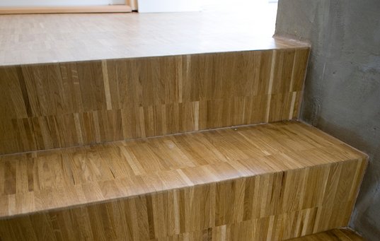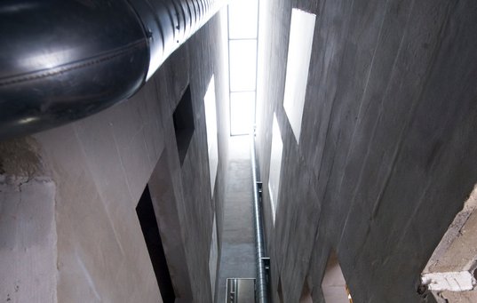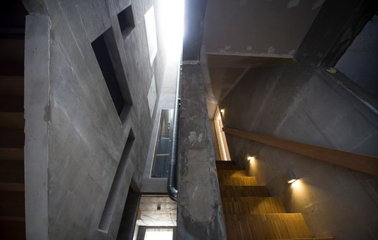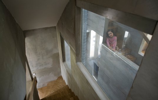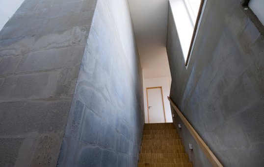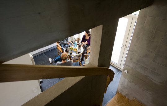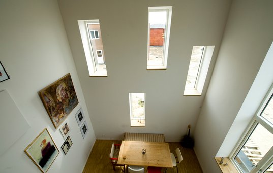 Husets interne trappe snor sig omkring en 12 meter høj lysskakt. Begge boliger har vinduer ud mod lysskakten, og beboerne ser hinanden glimtvis, når de bevæger sig op og ned ad trapperne. Særligt børnene er glade for det lille kig til naboen.