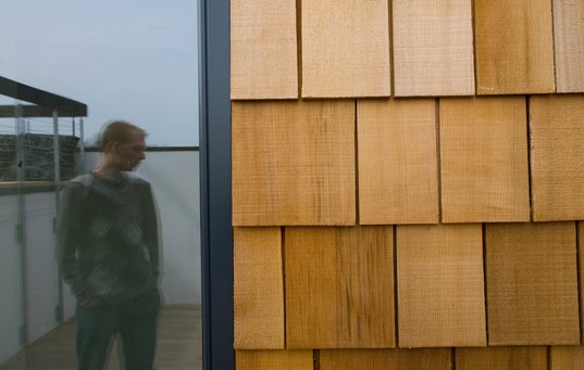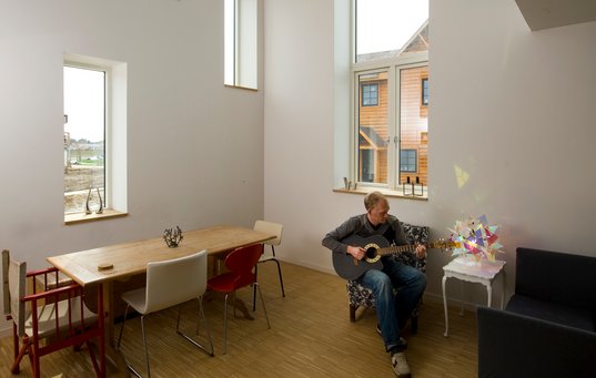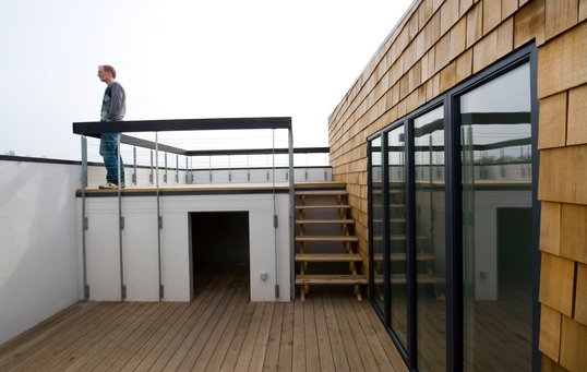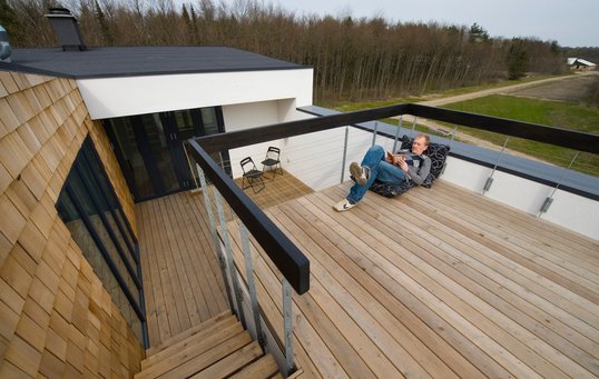 - Begge familier bor både oppe og nede, og vi har vinduer mod alle verdenshjørner, forklarer arkitekt MAA Pelle Sørensen, der har specialiseret sig i lavenergibyggeri og til dagligt driver tegnestuen Manifold.