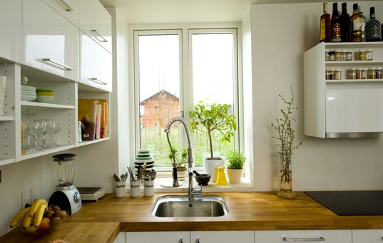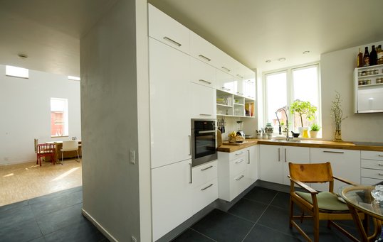 Køkken med udsigt til have. Fra det lille spisekøkken er der adgang til en "rigtig" spisestue.