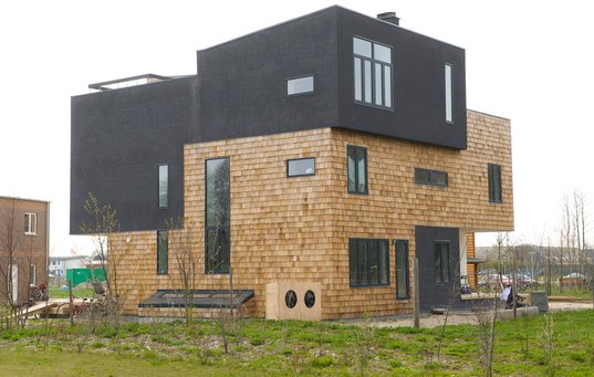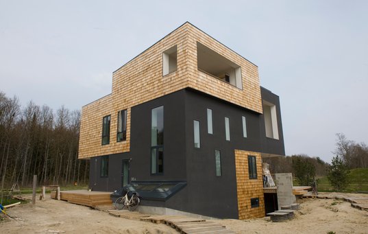 At huset er tænkt som en kærlig omfavnelse mellem to boliger afspejler sig tydeligt i facaden. Udefra ligner huset et skulpturelt favntag mellem to klodser - én i gyldent cedertræ og én i matsort puds. Pelle og Natallia bor i den sorte klods, mens naboerne, der er gamle venner fra gymnasietiden, bor i træklodsen.