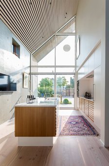 Resultatet er med arkitekt Jesper Korfs ord et tunnelhus, hvor den ene halvdel af huset er holdt i dobbelthøjde indenfor, så den flotte udsigt ikke spærres af hverken etageadskillelse, vægge eller døre. I stedet nyder de godt af det fantastiske lysindfald, der vælter ind af vinduerne i de syv meter høje glasgavle.
