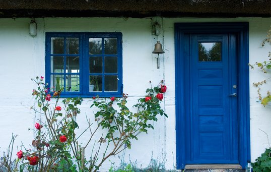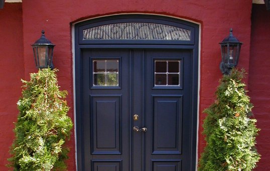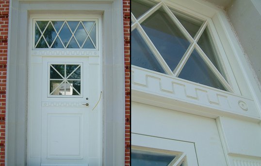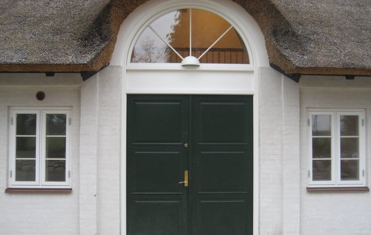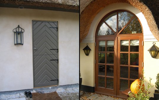 Se fx døren med lyshuller og sparkeplade, den specialfremstillede dør i mahogni eller den grå stalddør med smedejernsbeslag.